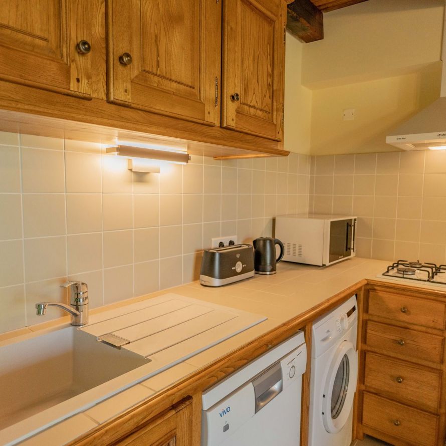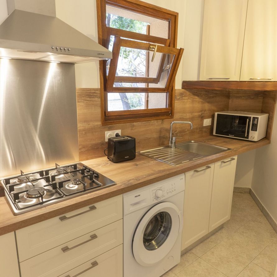 Küche mit Gas-Kochfeld, Mikrowelle, Kühlschrank, Kaffeemaschine, Waschmaschine und Geschirr